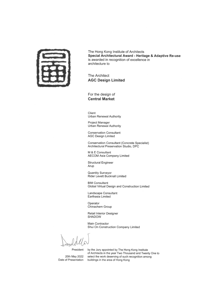 The RICS Awards showcase the most inspirational initiatives and developments in land, real estate, construction and infrastructure. The award recognises outstanding achievement, teamwork and companies. The multi-disciplinary team of Central Market demonstrated a highly innovative and interesting approach to a project of civic, historic and commercial import. This is a fantastic example of a combination between creativity, sustainability, technology and repurposing for a legitimate next phase of what is a very exciting project for Hong Kong.