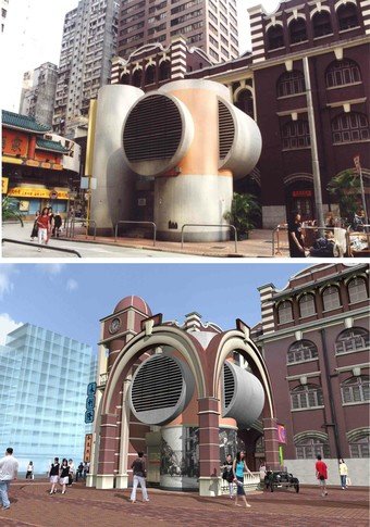 An artist's impression of the MTRC vent shaft after beautification works. The space in front of Western Market may be used for community activities to increase pedestrian flow.
