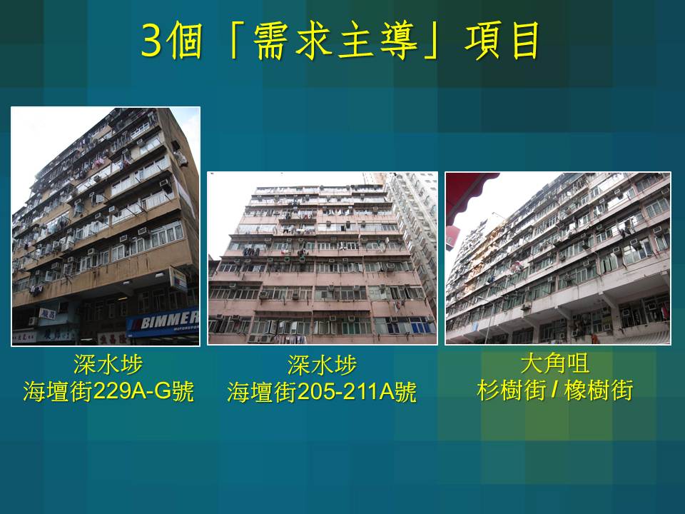 The three demand-led projects, two in Sham Shui Po and one in Tai Kok Tsui, will involve a total of 226 property interests and help improve the living environment of some 290 households, who are currently living in buildings of about 50 years old.