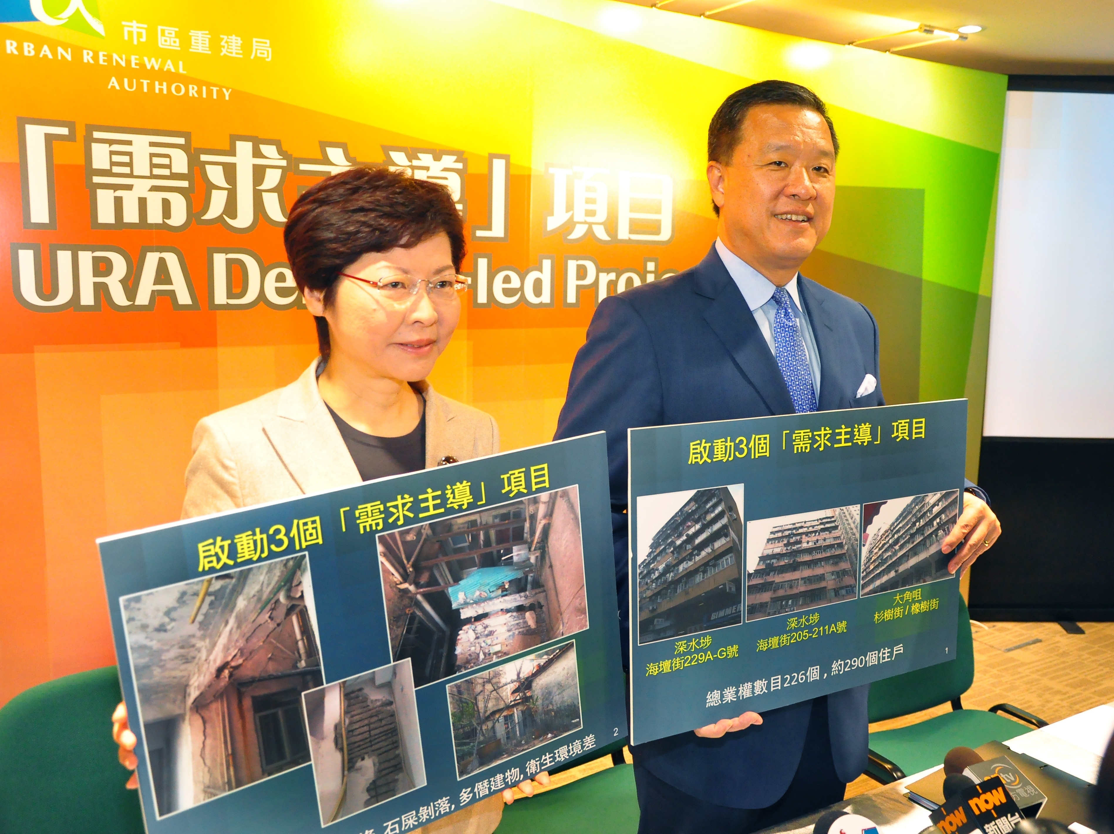 The Secretary for Development, Mrs Carrie Lam, and the Chairman of the URA, Mr Barry Cheung, witnessed this important milestone in urban renewal at a joint media briefing this morning to announce details of the three projects.
