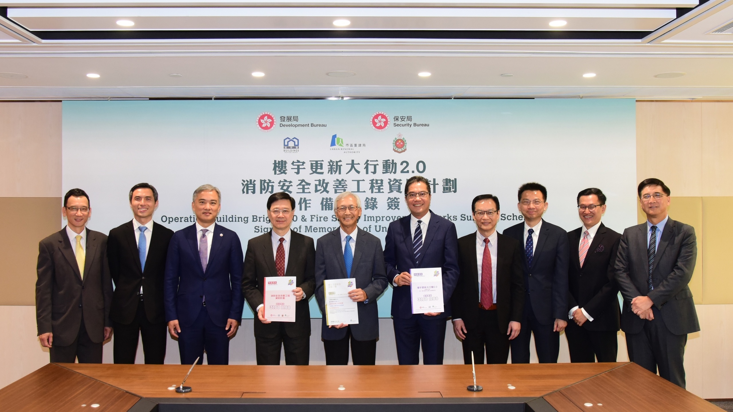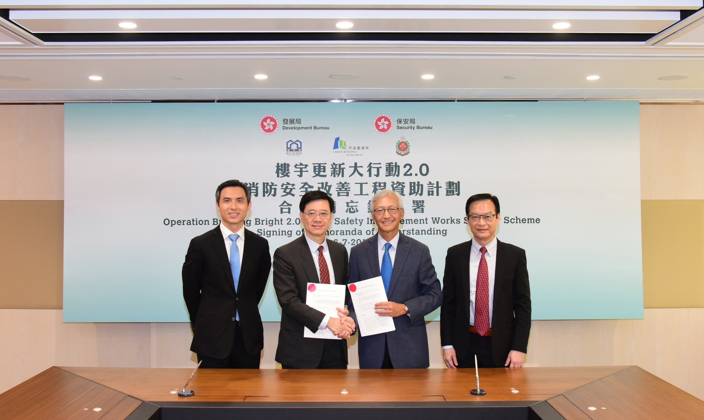 The Urban Renewal Authority (URA) today (Friday) signed Memoranda of Understanding (MOU) with the Development Bureau and the Security Bureau for the launch of Operation Building Bright 2.0 Scheme (OBB 2.0 Scheme) and Fire Safety Improvement Works Subsidy Scheme (FSW Scheme) respectively. The URA will also take over the work of the Hong Kong Housing Society (HKHS) under the Mandatory Building Inspection Subsidy Scheme (MBISS). Being fully responsible for handling all new MBISS applications including the areas originally served by HKHS, URA will provide a one-stop and comprehensive support to property owners on various building rehabilitation initiatives.