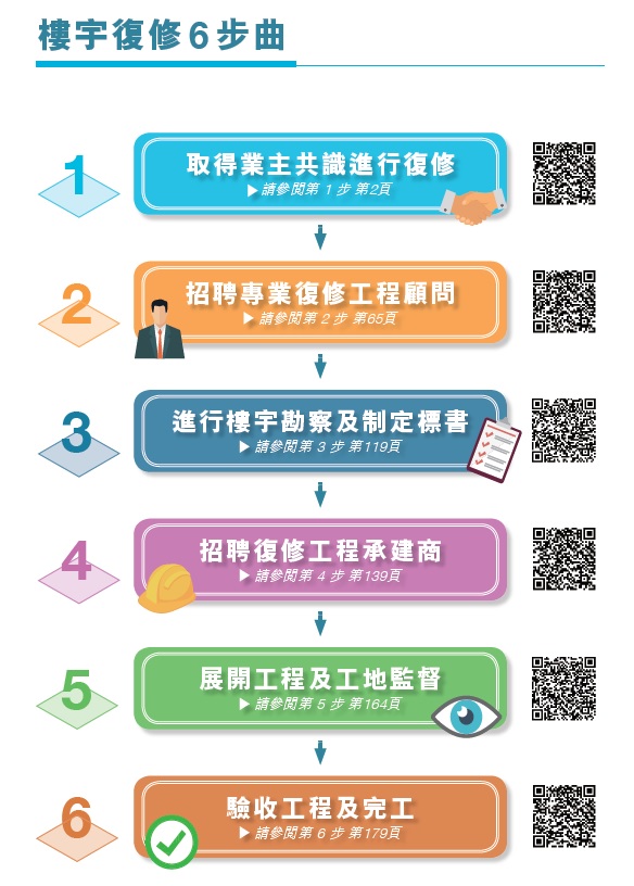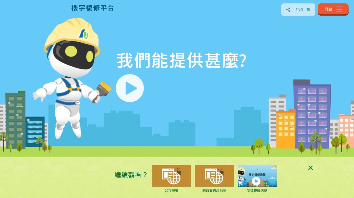 In light of the lack of knowledge in organising building rehabilitation works among old building owners, a series of animations, with BRbot as the main character, under the name of “Six Steps to Rehabilitation” is available on the Platform to explain the key milestones of the building rehabilitation workflow for simple and easy understanding. Besides, a Building Rehabilitation Guidebook with a broad range of information on preparatory work, appointment of consultants and contractors, as well as monitoring of works is available for download by owners to understand the work, procedures as well as legal requirements involved in each step of the building rehabilitation workflow.