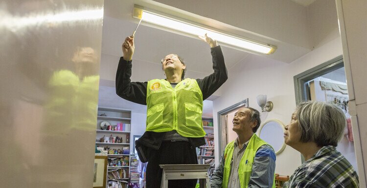 Volunteer repairmen help a single elderly Ms Chow to mend her lighting.