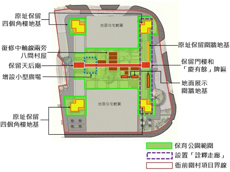 当中,衙前围村门楼、「庆有余」牌匾和天后庙作原址复修,围村的中轴线亦保留,让原建筑美学及围村氛围得以保存;历代建筑工程技术的演变,以及遗迹背后的古代科学,将透过展示部分围墙地基方式重现;围村角楼地基遗迹亦原址保留,连同围村入口两旁设置「诠释走廊」,让市民了解围村历史;至於围村的社会价值,则於日后保育公园举办的展览、导赏团活动中彰显;而在展现围村的文化精神方面,团队将在天后庙前方增设小型广场,鼓励村民复办太平清礁等节庆活动。
