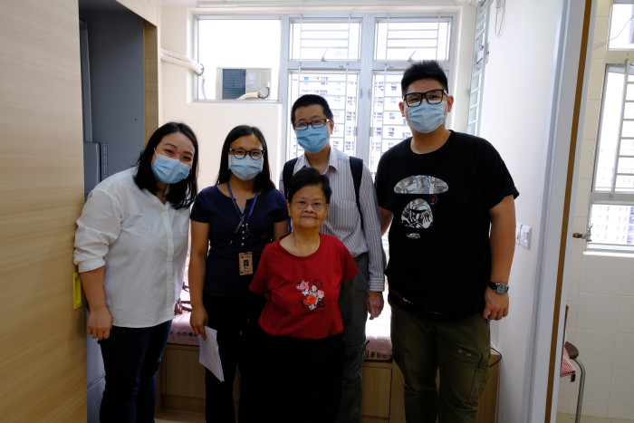 服务团队获得黄婆婆(左四)的信任。黄婆婆迁入新居后,众人亦齐齐来家访。配合黄婆婆的娇小身型,团队为她的新居加入长者友善元素,包括在客厅安装具自动升降功能的电动晾衫架,以免她要将身体伸出屋外使用晾衣架;亦为她在大衣柜内加装可升降的挂通,以增加衣柜的空间,及减少「擒高擒低」易生危险的机会;特低床架亦是针对她的身高而特别订造,各项设计改善了黄婆婆平日的起居生活。