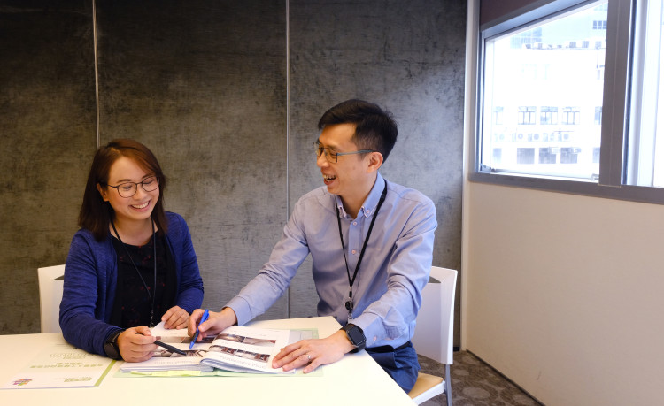 Alan(左一)和Bobo(右二)笑 说,加入市建局以来,这阵子是最 忙碌的了,但能够帮助长者申请资 助维修他们的家,再累也值得。前 线的Alice(左二)及Kelvin(右 一),有时甚至会收到老人家的问 候电话,算是忙碌中的一点甜。