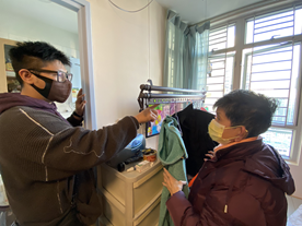 建造業關懷基金(CCF)綜合服務中心幹事陳浩賢(左)耐心教導李婆婆使用設有紫外線殺菌功能的電動升降晾衣架,讓雙膝關節有問題的她方便掛取衣服和消毒衣物,安心「居家抗疫」。