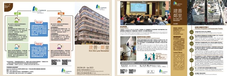市建局出版项目居民通讯 -- 《建善・邻里》,向受重建影响的兼善里居民发放项目相关资讯。