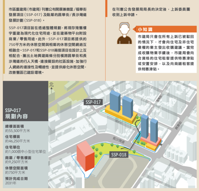 市建局自计划公布以来,透过不同方法与持分者沟通,主动接触受重建影响的业主和居民,交代项目的规划建议,当中包括透过整体规划,将属网格状旧式楼宇布局的兼善里一带楼群及道路纳入项目范围,重新规划以地尽其用,增加住宅供应,并将面向昌华街的建筑物向后移,提供绿化休憩空间及兴建连接SSP-018项目拟建社区设施的行人天桥,改善长沙湾南北行人畅达性及昌华街的行人环境,以及SSP-017项目最新进展,并举办了8场业主和居民简介会,又将载有项目资讯的居民通讯《建善・邻里》投放於每户的信箱中,向居民介绍两个项目的规划建议。
