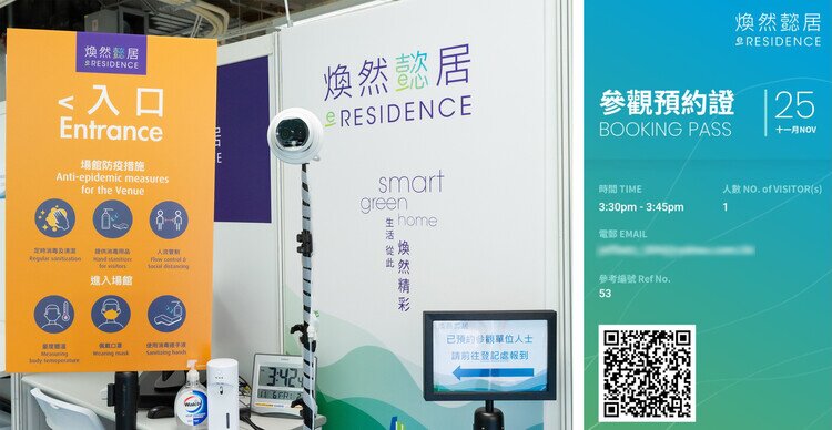 焕然懿居示范单位场地采取一系列防疫安排(左图),已预约参观的市民,进场前要先量度体温,并出示参观预约证(右图)登记。