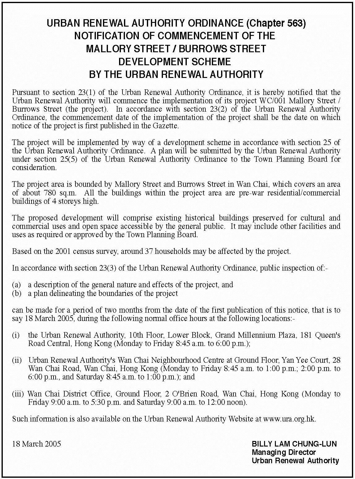 未来两个月内,市民可於市建局位於上环皇后大道中一百八十一号低座十楼的资讯中心及湾仔湾仔道二十八号忻怡阁地下地区办事处,以及湾仔民政事务处位於柯布连道二号地下的谘询服务中心,查阅有关计划的土地界线图则及一般资料。