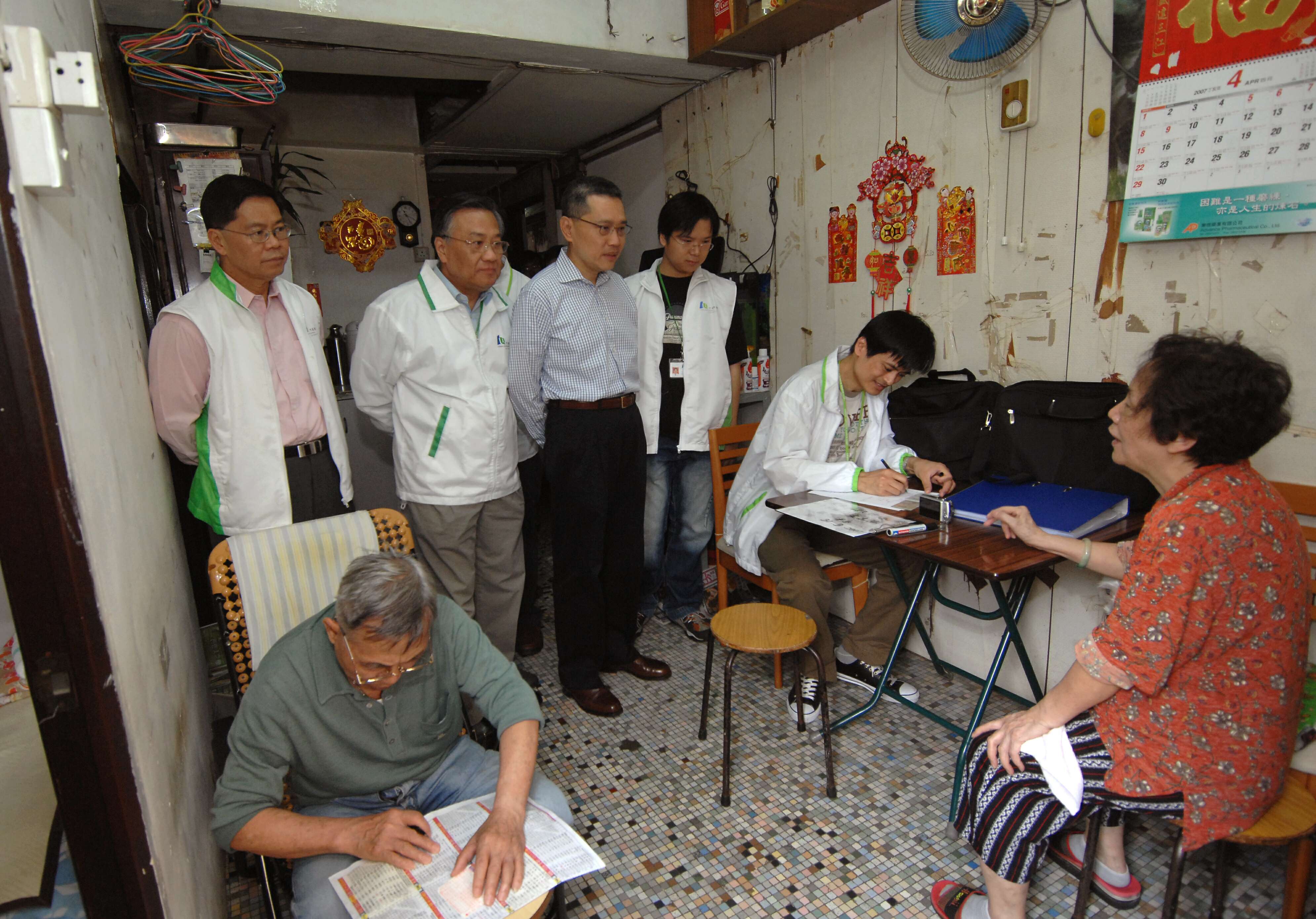 市区重建局经宣布正式启动历来最大型的重建项目後,市建局主席郑维新先生(左三)今日(星期六)在市建局行政总监林中麟先生(左一)及地区发展总监李敬志先生(左二)的陪同下,探访一些在重建区破落楼宇内生活的家庭。 市建局今次接近总动员参与观塘项目的冻结人口调查。二百多名参与探访居民工作的员工,来自不同职级和部门,包括平日负责茶水和的杂务的员工。 (完)