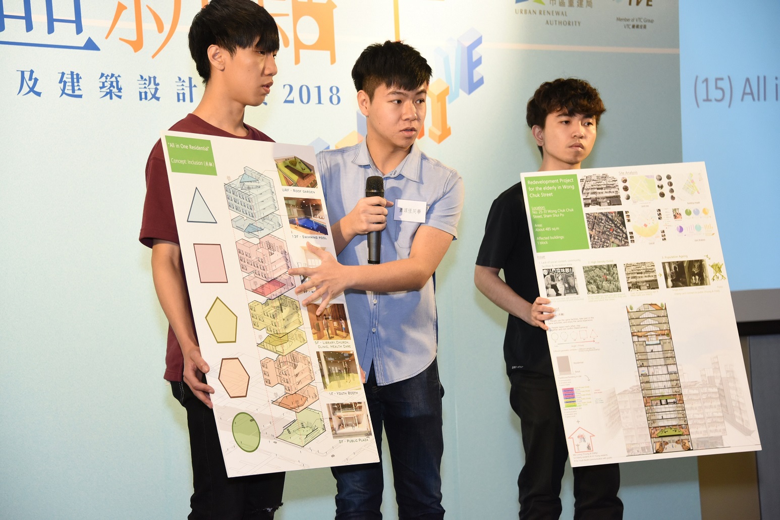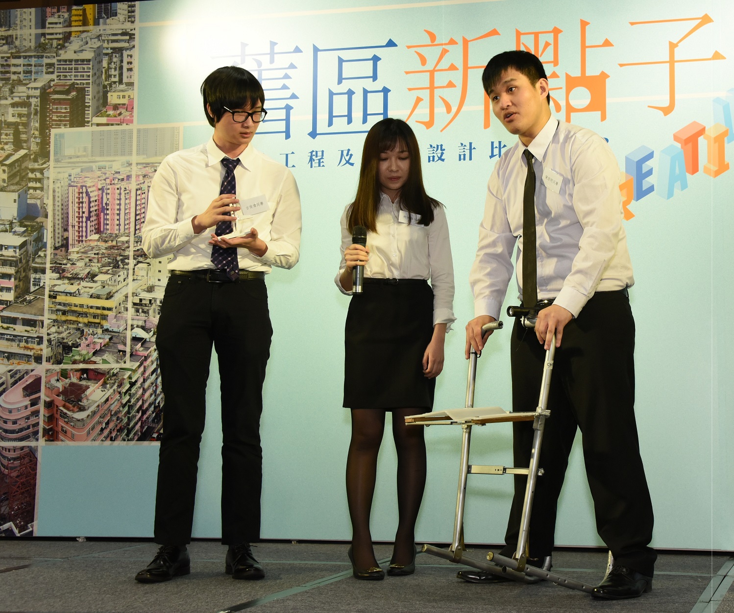 为鼓励大专学生学以致用,市区重建局(市建局)及职业训练局(VTC)旗下的香港专业教育学院(IVE)合办「旧区‧新点子」创意工程及建筑设计比赛,让年轻人透过创意设计,改善旧区长者的生活质素,并于昨晚(星期三)举行总决赛暨颁奖典礼。