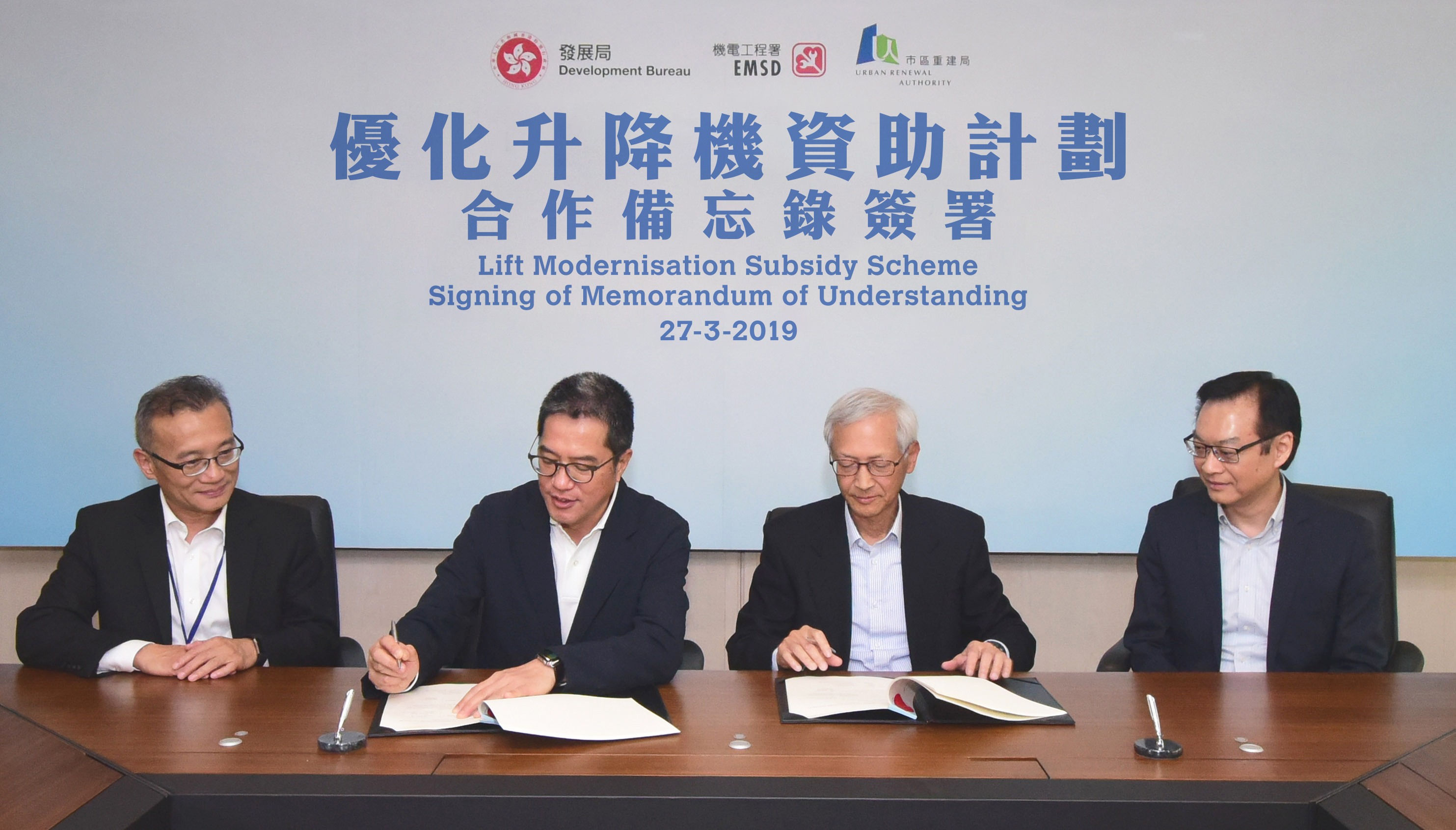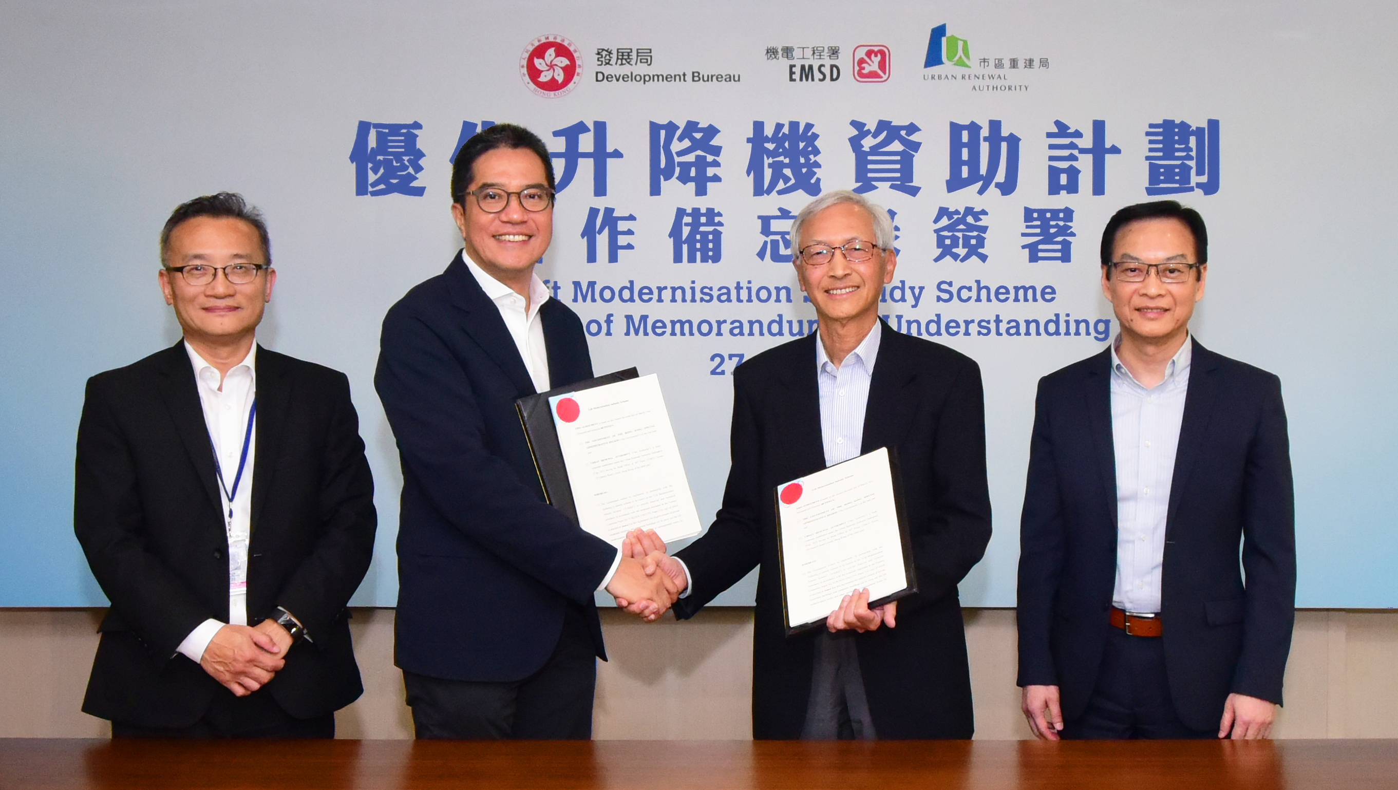 市区重建局(市建局)今天(星期三)与发展局就开展「优化升降机资助计划」签订合作备忘录。该计划将于本星期五(2019年3月29日)接受首轮申请,截止申请日期为2019年7月31日。
