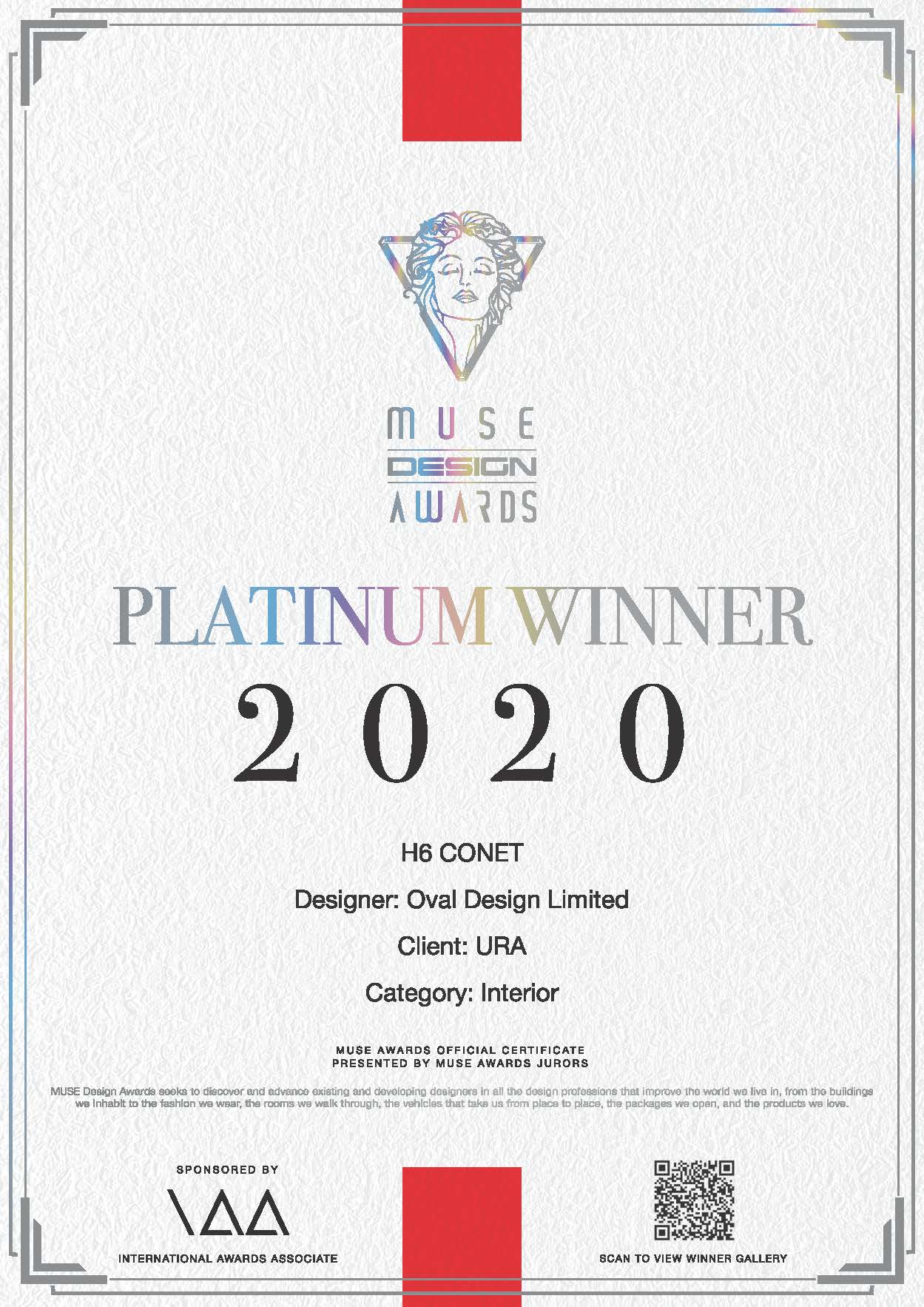 「H6 CONET」於今年4月公布的 2020年度缪斯设计大奖(Muse Design Awards)中,夺得「室内设计 ‒ 公民 / 公众空间」类别的最高白金级别,成为此类别中全球三个获奖项目之一,亦是唯一一家香港机构夺取此奖项。