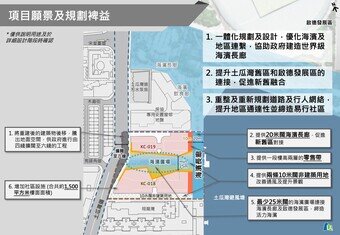 麦中杰补充说:「两个计划将重新规划土地用途,透过一体化规划及设计,将重建后的建筑物从海滨后移,腾出的地面空间,可提供约20米阔的海滨长廊,并与毗邻启德发展区内的海滨饮食廊、启德体育园及海滨长廊等海滨发展连接,优化海滨环境,并促进九龙东海滨整体发展,协助政府达致建造无间断的世界级海滨长廊这项规划目标。」
