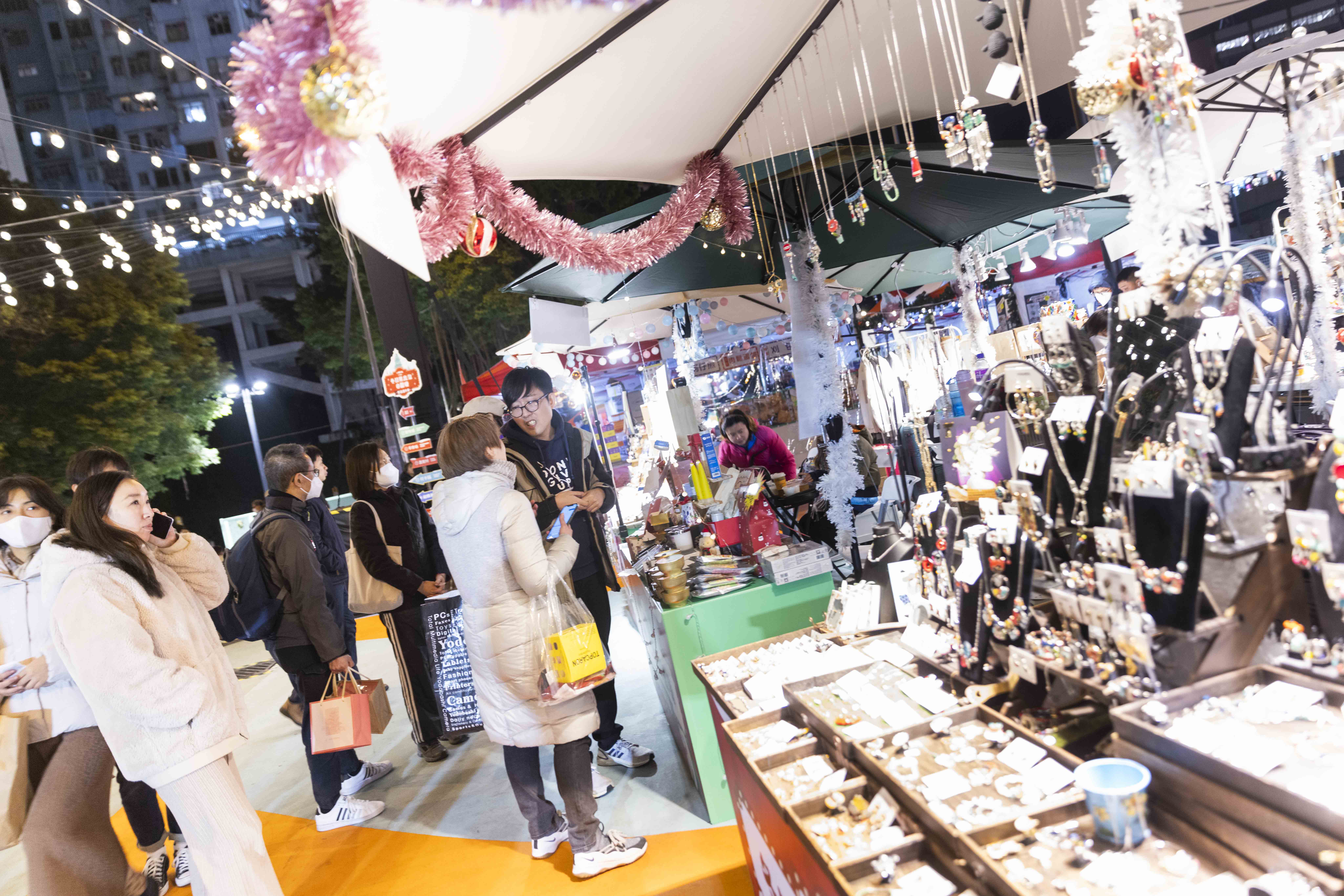嘉宾亦参观圣诞嘉年华的市集摊档及多个「打卡位」,包括巨型飘雪水晶球和以观塘小巴为造型的充气装置。