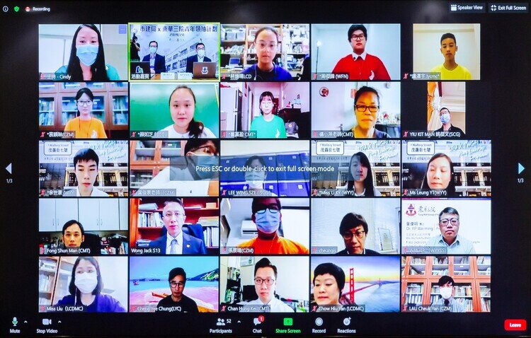 专题报告日上,由东华三院行政总监苏𧙗安先生(上图右) 及市建局行政总监韦志成先生(上图左)组成的评审团,透 过视像会议,与学生互动交流(下图)。