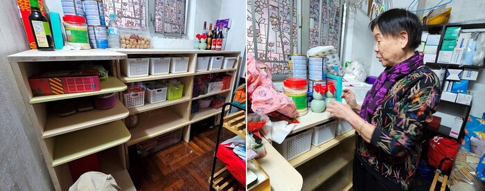 至於陶婆婆,由於她有不少鞋子及罐头食物,义工队设计了一个L型多用途储物柜,方便她分类摆放不同物品。柜子的左边底部预留摆放行李箱等大型杂物;右边柜则呈长方形,主要存放罐头及食品,并设有透明趟门,使陶婆婆能清楚检视物品的数量,及方便寻找所需物品。