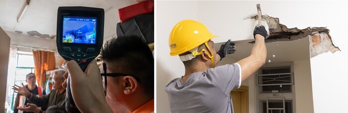 收到市建局的转介后,建设健康九龙城协会的专业工程师和测量师团队,会带同红外线探测仪等专业工具,上门为长者住户勘察,为单位「断症开方」(左);施工人员根据专业的评估报告建议,为户主进行维修工程。(右)