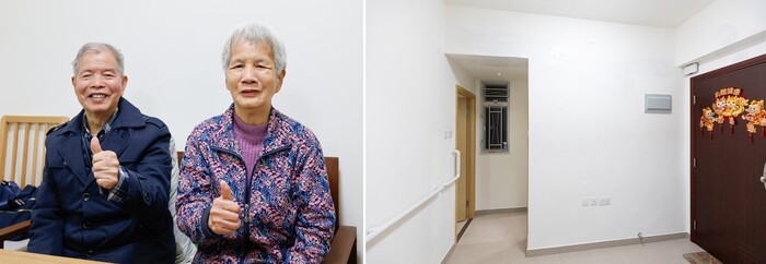 林长民夫妇(左图)感谢市建局协助完成维修(右图),解决单位内石屎剥落问题,让他们安心居住。