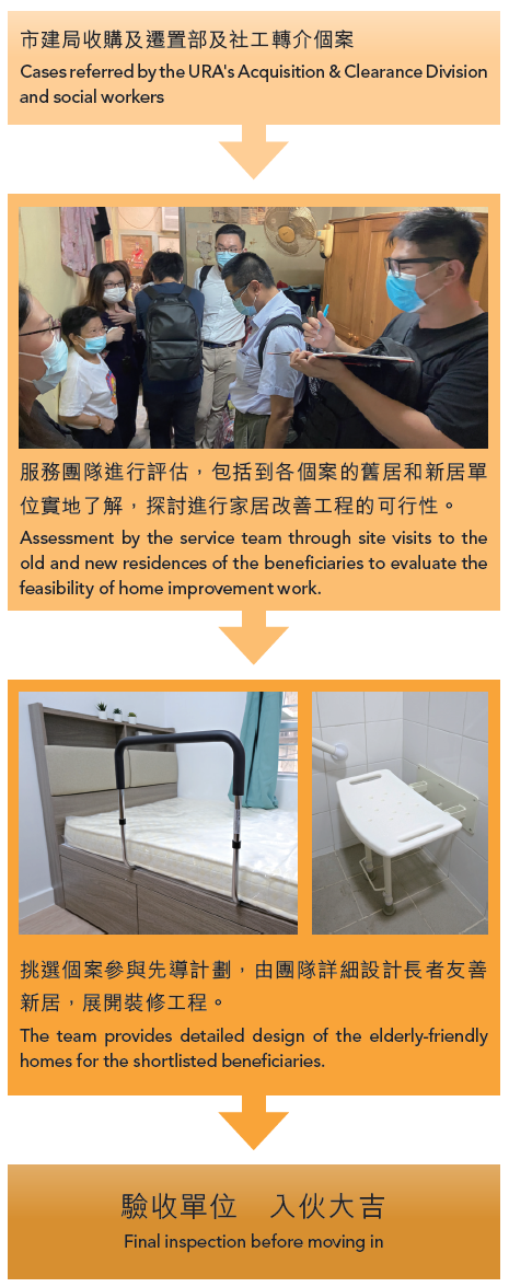 市建局特別與多個夥伴機構合作,包括香港聖公會福利協會、其轄下的社會企業錦華設計工程有限公司、及建造業關懷基金綜合服務中心等,組成跨專業服務團隊,度身設計家居及訂造合適家具,提供「一條龍」服務,令計劃效益更加事半功倍。