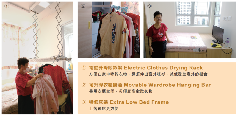配合黃婆婆的嬌小身型,團隊為她的新居加入長者友善元素,包括在客廳安裝具自動升降功能的電動晾衫架,以免她要將身體伸出屋外使用晾衣架;亦為她在大衣櫃內加裝可升降的掛通,以增加衣櫃的空間,及減少「擒高擒低」易生危險的機會;特低床架亦是針對她的身高而特別訂造,各項設計改善了黃婆婆平日的起居生活。