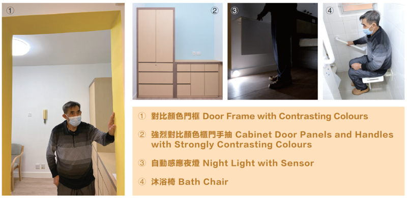 針對蔡伯伯的需要,服務團隊為他的新單位設計了色彩鮮明的門框,減少出入時候碰撞的機會;團隊亦特別訂造了採用強烈對比顏色的櫃門手抽和門板,蔡伯伯使用時就更為方便及安全;另一項貼心設計是在走廊和客廳裝設自動感應夜燈,蔡伯伯晚間在家中走動,就更加安全。考慮到蔡伯伯的長遠需要,團隊更為他增添了其他長者友善家居設備及輔助器具,包括預留了擺放手杖的位置,以及裝設了床欄及沐浴椅。