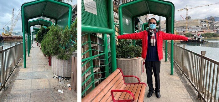 「五街」現有的海濱休憩公園,約2.5米闊,只有九龍城區議員潘國華(右圖)伸長兩手的闊度,而且環境衞生惡劣,未能吸引附近居民前往,令環觀優美的臨海休憩土地被白白浪費。