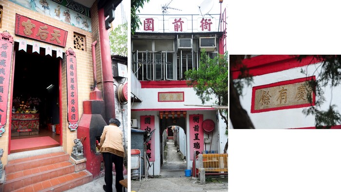 衙前圍村的「三大文物」天后廟(左)、門樓(中)和「慶有餘」牌匾(右),將保留於保育公園內。