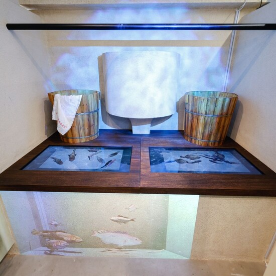 展覽佈置加入具互動投射技術的裝置並增設屏幕,模仿魚檔售鮮魚的情景。