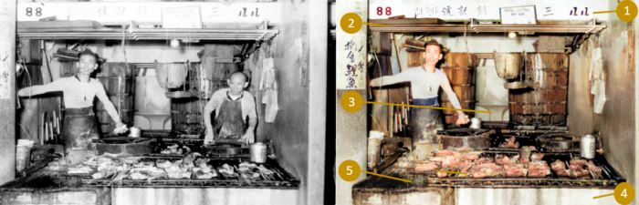 為了讓到訪人士能進一步體會到昔日中環街市的販賣氛圍,市建局除了參考歷史文獻將魚檔保育復修,還委托了著名視覺及數碼藝術家黃宏逹(Victor),以創新的AI人工智能科技,修復一張攝於1953年、魚販在中環街市販賣情景的相片,作為活化保育魚檔的藍本,以重塑舊日街市販賣的情景。