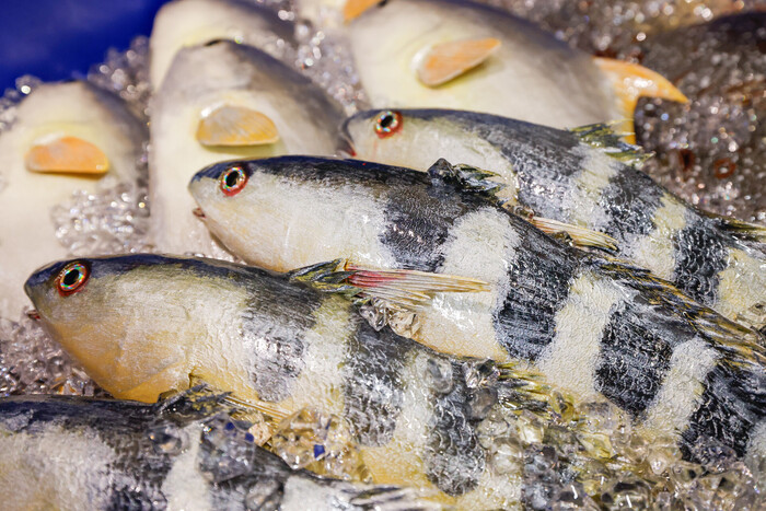 「鮮魚」利用真魚模具製成,再由人手逐條上色及加工,由魚眼、鱗片、魚身到魚鰭均栩栩如生,細緻地展現魚鱗反光的視覺效果,立時為魚檔增添不少生氣。