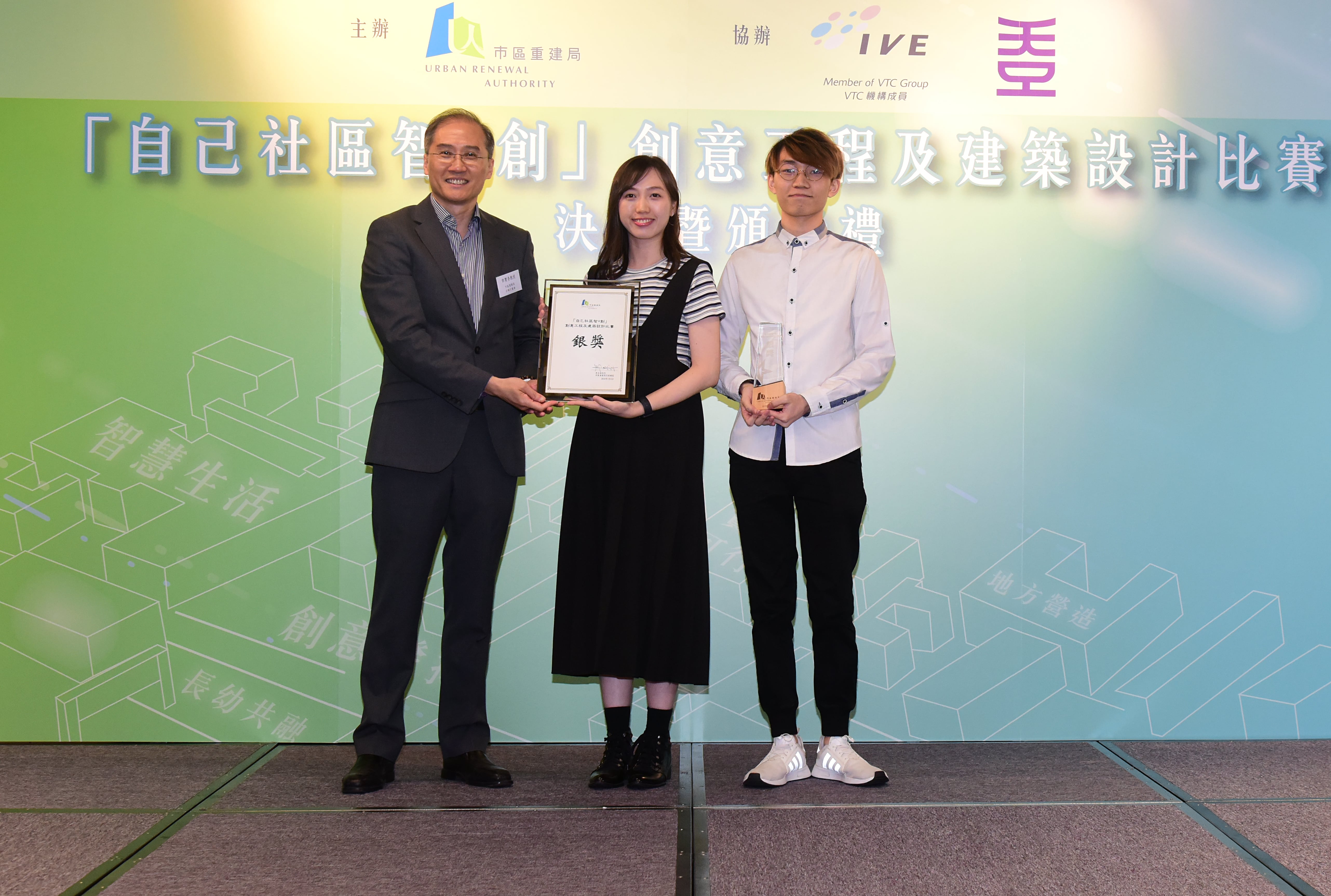就讀IVE(青衣)建築設計及科技高級文憑二年級的戴俊君、李德熙及梁可晴同學,憑著作品「別有洞天」奪得比賽的「金獎」及「最具社區實用功能獎」。同學們以中環街市為參賽題目,構思在建築物地下中庭的休憩空間加設水幕,一方面用以紓緩外來噪音,為中環上班族提供一個恬靜的空間,同時亦作為電子顯示屏,為遊人提供溝通平台,透過投射其他中西區景點資訊,推廣中西區地方特色。該隊代表戴俊君同學在頒獎禮後表示:「隊員在參賽過程中均獲益良多,大家一同進行資料搜集及創作,明白到參與不同建築項目能涉獵到不同的知識,擴闊了我們的眼界。」