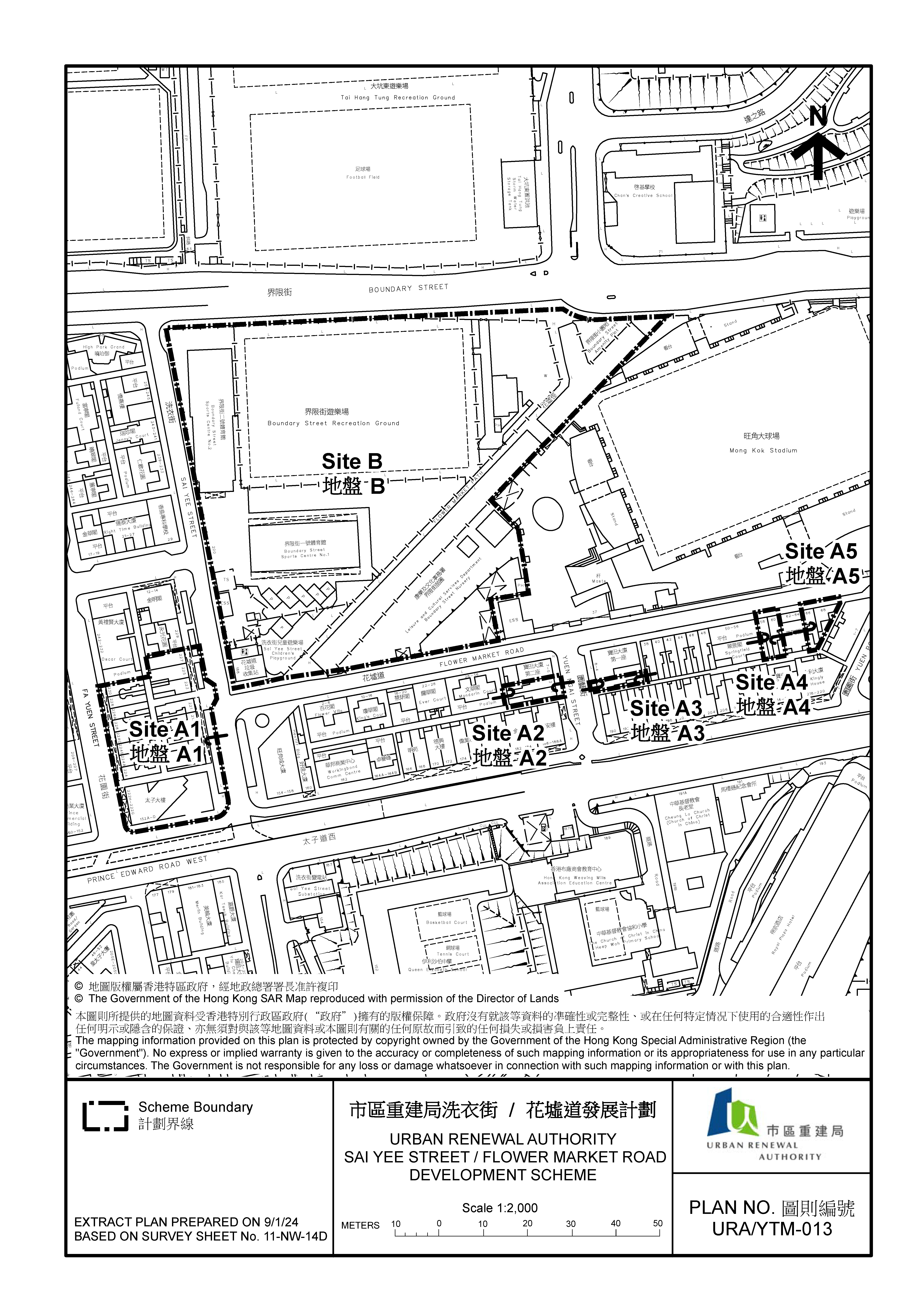 YTM-013計劃總地盤面積約為29,320平方米,分為兩個主要地盤;地盤A由一個較大(A1)及四個較細的地盤(A2-A5)組成,涉及23幢樓齡介乎64至76年的舊樓,四個較細的地盤零散分佈於花墟範圍,毗鄰市建局太子道西/園藝街保育活化項目,雖然重建潛力較低,但位置具策略性;地盤B則涵蓋界限街遊樂場,界限街一號及二號體育館、洗衣街兒童遊樂場及界限街苗圃等現有政府設施及分散的休憩空間。