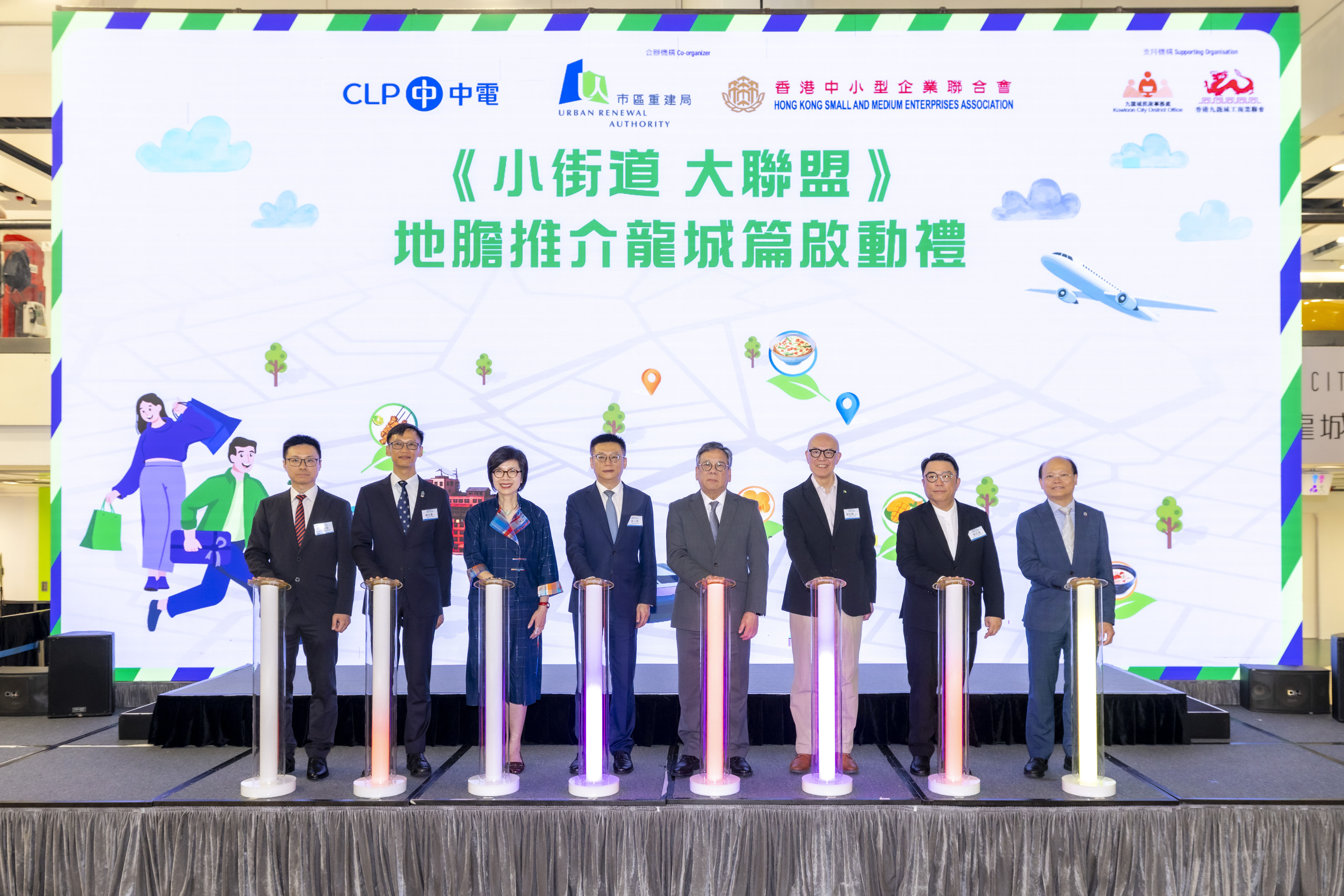 啟動禮由商務及經濟發展局局長丘應樺先生、中聯辦協調部副部長徐小林先生、九龍城民政事務專員蔣志豪先生作主禮嘉賓,在市建局行政總監蔡宏興先生、中華電力企業發展總裁莊偉茵女士、中華電力客戶成功及銷售總監盧志華博士、中小企聯合會會長郭志華先生,以及中小企聯合會主席鄭仲邦先生陪同下,共同主持啟動儀式。多名立法會議員、九龍城區議員及相關持份者亦有出席活動。