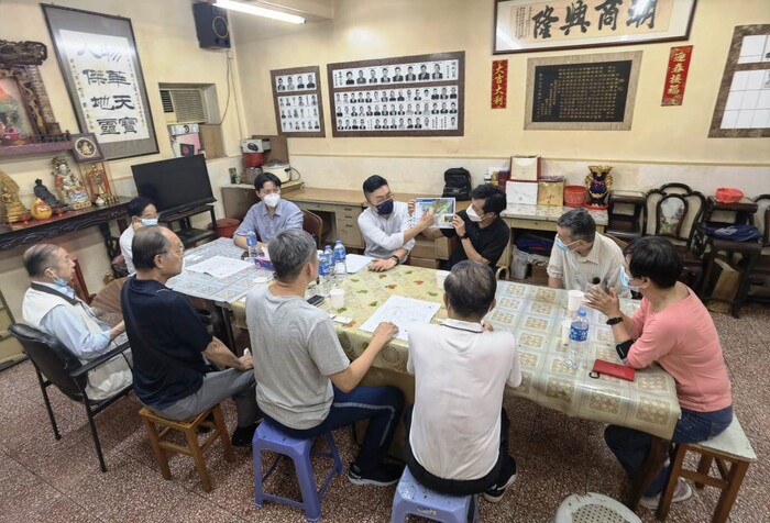 九龍城潮僑盂蘭會希望把區內的傳統節慶活動在九龍城傳承,市建局職員向會方代表講解重建計劃內容。