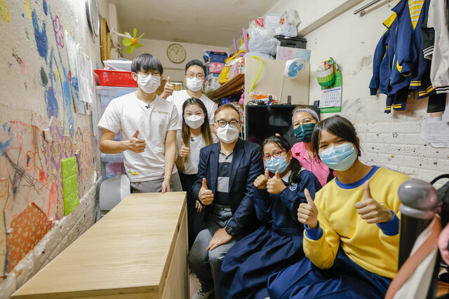 另一組來自香港大學的義工隊,則服務居住在九龍城區一幢唐樓內的一個劏房戶家庭。同學們留意到,戶主的兩名女兒沒有足夠的空間放置書枱,她們平時要盤膝坐於床上學習和做功課,長期以不良姿勢讀書,影響成長;加上劏房也沒有位置容納飯枱,一家人難以同枱食飯。