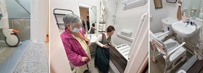 浴室安裝了斜台、防滑地板、扶手、座位、可供沐浴時使用的家居輪椅,配合兩位長者的特別需要。