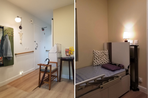 單位的布局和傢具,均配合兩位長者的需要而設計,例如方便輪椅出入和具對比顏色的斜台、可放置枴杖和兩傘的座椅和備有床欄的睡床。